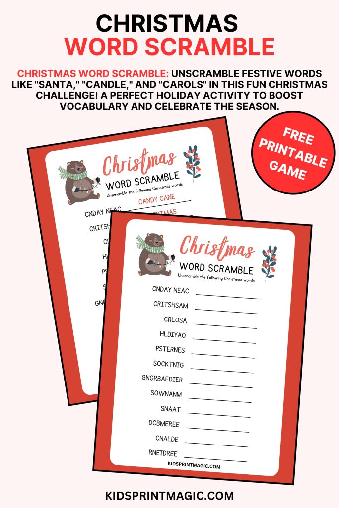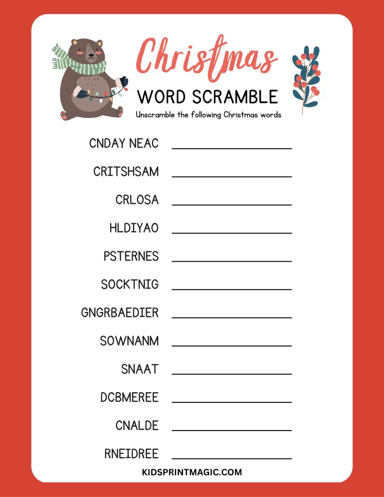 Enjoy a festive challenge with the Christmas Word Scramble! Unscramble jumbled Christmas-themed words like “Santa,” “reindeer,” and “stocking” to reveal the holiday terms. This game is perfect for holiday gatherings, classroom fun, or a cozy winter activity to sharpen vocabulary and celebrate the season!