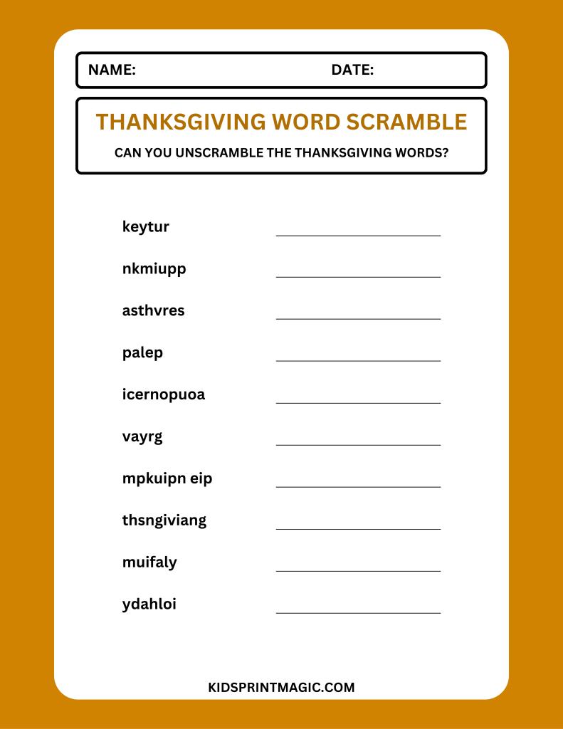 - Unscramble Each Word: Try to figure out the correct word for each scramble. For example, “keytur” unscrambles to turkey and “nkmiupp” to pumpkin.