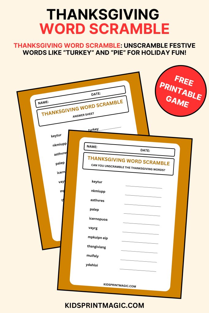 This Thanksgiving Word Scramble Game is designed to be printed on a standard 8.5×11-inch sheet of white printer paper or cardstock. For a more durable option, especially if you plan to laminate and reuse the Thanksgiving Word Scramble Game, cardstock is recommended.