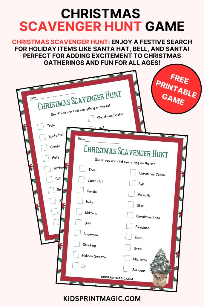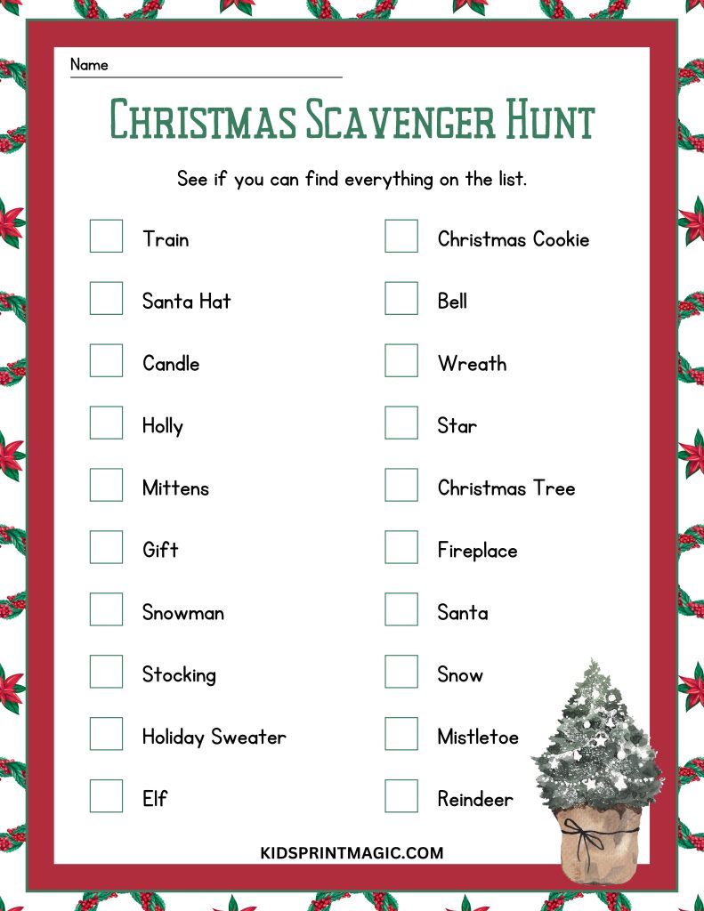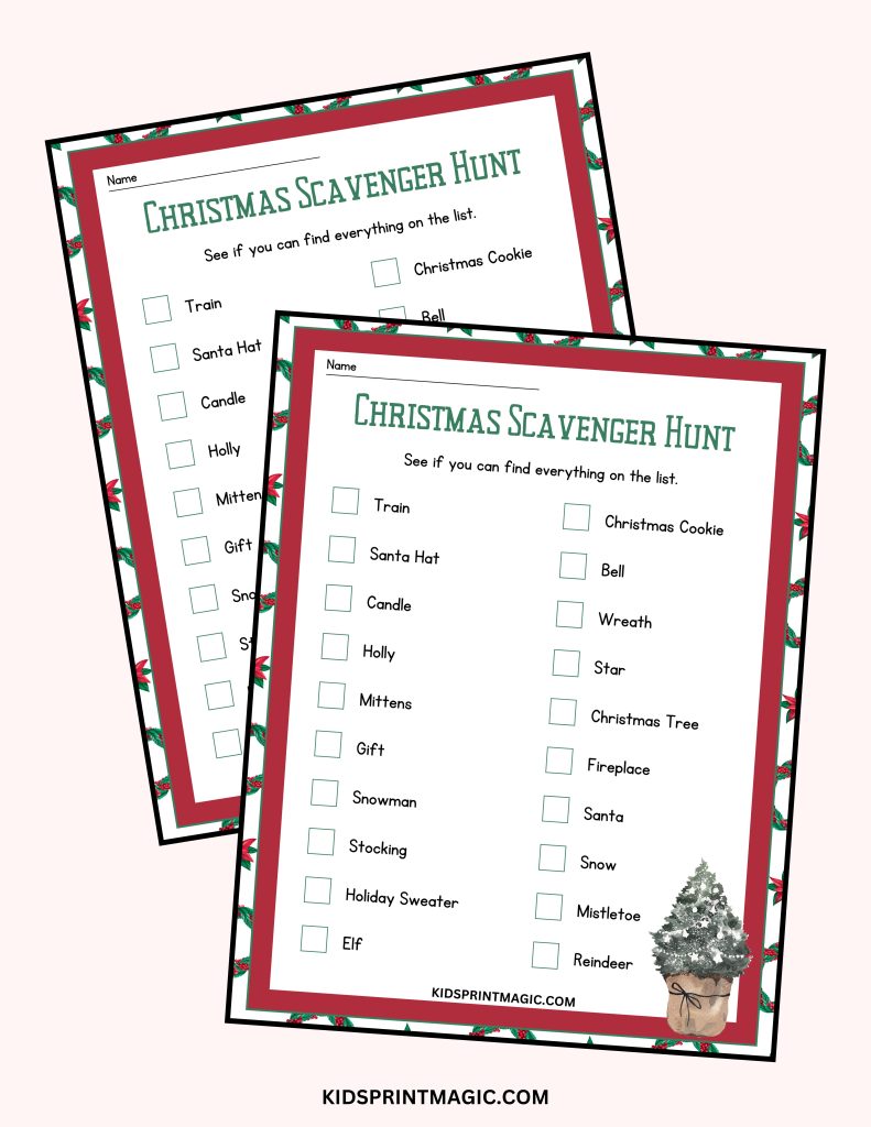 - Print the Scavenger Hunt List: Start by printing a Christmas Scavenger Hunt list for each player or team. The list includes festive items like “Santa Hat,” “Christmas Tree,” and “Elf.”